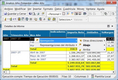- Total: seleccionamos en la cabecera del atributo que queremos desglosar (por ejemplo, el Trimestre Año), y con el botón derecho, desde el menú contextual seleccionamos Navegación –> Abajo –> Mes Año. El informe se recalculara y se mostrara toda la información desglosada al nuevo nivel.