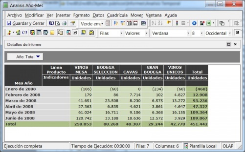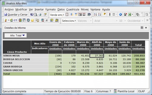 La herramienta de reporting nos permite en tiempo de ejecución modificar el aspecto del informe, pudiendo intercambiar filas y columnas, cambiar el orden de los elementos en la visualización, ocultar un indicador (aunque sigue estando asociado al informe). Tambien podremos llevar una fila a columnas o viceversa o seleccionar un determinado atributo y llevarlo a la ventana de paginación (momento en el que pasara a formar parte del filtro de paginación). Veamos un ejemplo sencillo de un informe de analisis de ventas por Linea de Producto y Mes (en la filas estan las lineas de producto y en las columnas los meses):