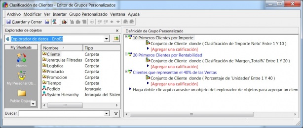 Ademas del grupo personalizado indicando valores de atributos, podemos crear grupos personalizados que califican sobre valores (por ejemplo los 10 primeros clientes por importe, los 20 primeros clientes por rentabilidad, los clientes que representan el 40% de las unidades vendidas). Para este caso, la definición del grupo personalizado sería la siguiente: