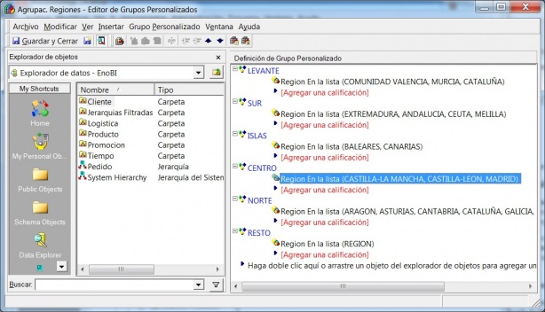 Para nuestro ejemplo, hemos creado un Grupo Personalizado que incluye varios grupos de atributos. El objetivo es realizar una clasificación de las regiones por Zonas. Por ejemplo, la zona Levante incluye la región de Valencia, Murcia y Cataluña. La region Sur incluye Andalucia, Extremadura, Ceuta y Melilla. Y así con el resto de las regiones. La definición del grupo personalizado sería la siguiente: