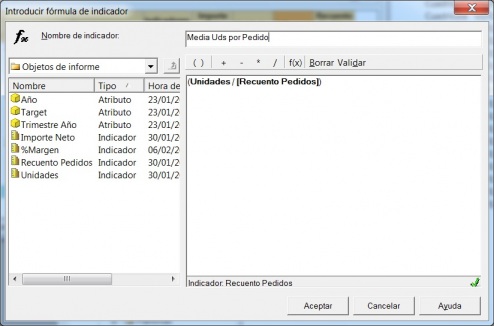 Para añadir una columna calculada, seleccionaremos la opción Insertar –> Calculo. Nos aparecera el editor de indicadores donde podremos definir la formula de calculo de la nueva columna. En el editor nos aparecen unica y exclusivamente los indicadores del informe y los atributos (también los podremos utilizar en el calculo, por ejemplo, para obtener un recuento de sus valores).