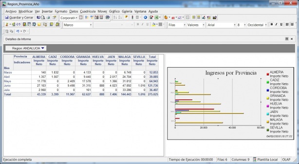 Ademas, Microstrategy nos permite combinar en un mismo informe la tabla cruzada y su correspondiente informe. Por ejemplo, para el ejemplo que hemos visto, podriamos tener las ventas por mes y región-provincia. Conforme vayamos cambiando en la paginación la región, los valores en la tabla cruzada se irían actualizando, asi como los valores reflejados en el gráfico.