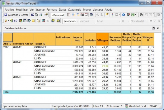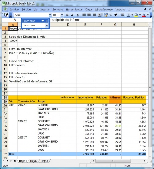 En nuestra prueba hemos ejecutado un informe de Ventas por Año, Trimestre y Target desde Excel, y todos los formatos, colores, Umbrales, etc. se han mantenido y se han pasado exactamente igual en la hoja de calculo que se nos ha creado automáticamente.