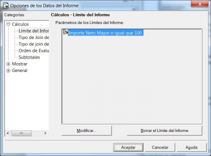 - Limites a nivel de informe: en las opciones de datos del informe, podemos indicar criterios adicionales de filtrado que produciran como resultado que no se visualicen los valores que no cumplan las condiciones. Por ejemplo, si en un informe de ventas indicamos la condición de la imagen (Importe Neto Mayor o Igual que 100), no se mostrara, cuando ejecutemos el informe, ninguna linea que no cumpla dicha condición. Pero una cosa importante, los valores filtrados si apareceran reflejados en totales y subtotales del informe. Es una forma útil de quitar información no relevante, aunque si siga considerandose para los analisis de importes totales.