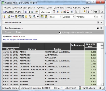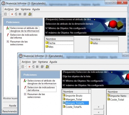 Vemos como el informe nos muestra la lista de atributos e indicadores que hemos preconfigurado, y podremos elegir entre ellos para llevarlos al informe al lugar correspondiente donde se incluyeron en el diseño. Con la selecciónes realizadas, mas el filtrado propio de cada informe, estaremos dejando al criterio del usuario que información quiere ver en cada momento. Esto nos puede ser util para reducir el número de informes disponible o para que el mismo informe se utilice para funciones diferentes según nuestras necesidades.
