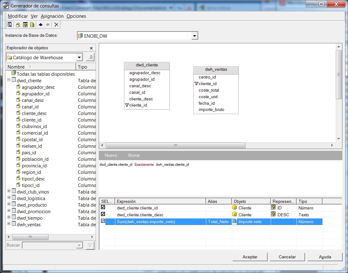 - Consolidaciones: es un concepto similar al de los grupos personalizados. Las consolidaciones nos permiten crear atributos “ficticios”, que pueden ser agrupaciones de estos y para los que luego realizaremos operaciones aritmeticas. Las consolidaciones son mas eficientes a nivel de SQL y los calculos se realizan a nivel del Motor análitico (en lugar de en la consulta al DW, como es el caso de los grupos personalizados). En el ejemplo podeis ver el editor de consolidaciones. En los tres primeros grupos, hemos indicado los valores de las lineas de producto que queremos incluir en ellos, solo de un determinado atributo. En el ultimo grupo, Cavas Rueda, hemos indicado dos condiciones sobre atributos diferentes, la linea de Producto CAVAS y la denominación de origen RUEDA (Cavas fabricados en la denominación de origen Rueda). Las consolidaciones se utilizan luego en el editor de informes como si fueran un atributo.