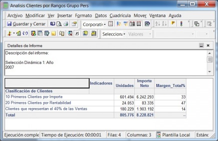 Observad como se pueden añadir tantos subgrupos dentro de un grupo personalizado como se deseen. En este caso, hemos añadido 3. Cada uno califica sobre un indicador diferente y con un criterio de agrupación diferente (Clasificación, Porcentaje). El grupo personalizado lo hemos incluido en un informe, y el resultado de la ejecución sería el siguiente: