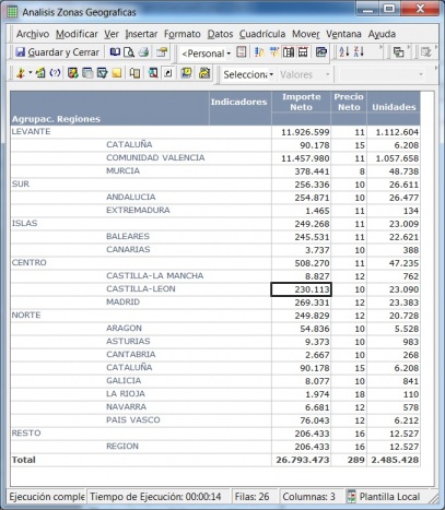 Podemos ver como se ha realizado la clasificación de la información y como aparece desglosado todo según la jerarquía definida al crear el grupo personalizado. Cuando se define el grupo personalizado, se puede predefinir como queremos que se vea la representación jerarquica, los subtotales, si el elemento padre aparecera en la parte superior o inferior de los hijos, etc.