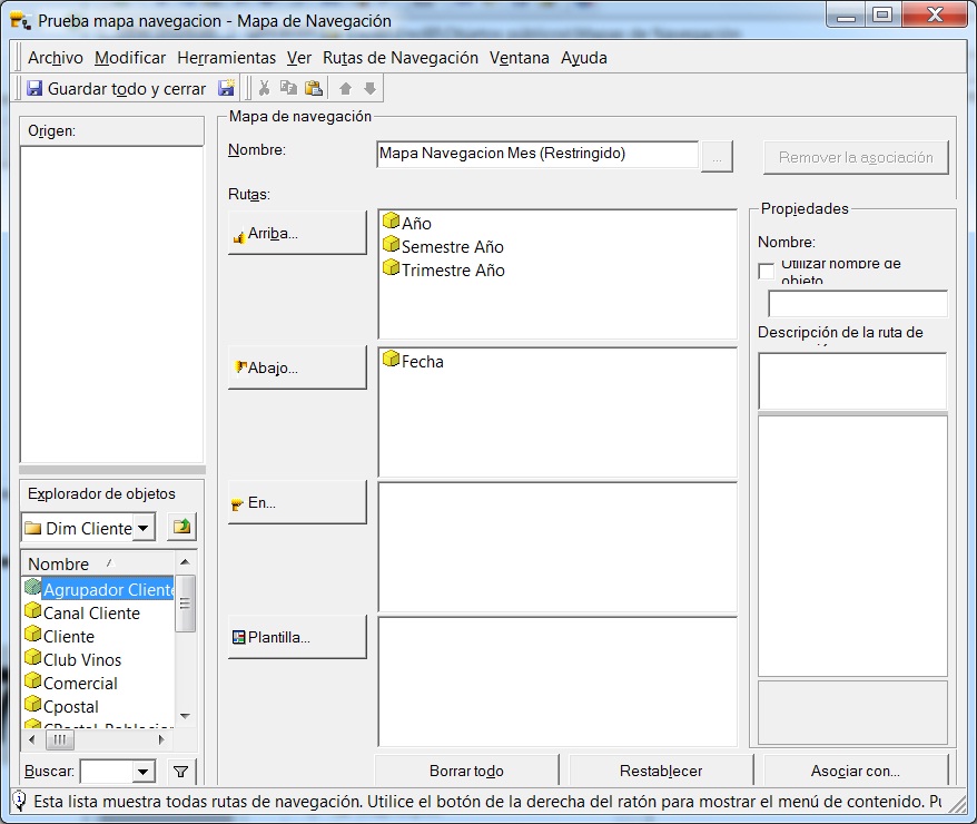 - Mapas de navegación: nos permiten establecer los patrones de como será la navegación en los informes. Es decir, podremos indicadar que atributos estarán disponibles para la navegación hacia arriba, hacia abajo o hacia otra dimensión. Sino se crea ningún mapa de navegación, se utiliza el de proyecto que incluye todas las jerarquias de usuario. Si deseamos personalizarlo, podemos hacerlo a nivel de proyecto (general para todos elementos), o bien a nivel de atributos, jerarquias o consolidaciones. Cuando el objeto se utilice en un informe, se reemplazara el mapa de navegación general por el propio. También se pueden asociar mapas de navegación a un informe o una plantilla. En la imagen posterior, podeis ver un ejemplo de mapa de navegación, que asociariamos al atributo mes (en el estamos restringiendo la navegación hacia arriba a solo los atributos Año, Semestre y Trimestre, y a nivel inferior a Fecha, no permitiendo navegación transversal).