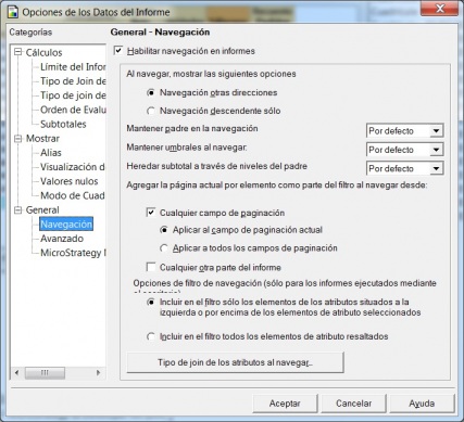 La navegación se puede configurar a nivel de informe, de forma que podemos tener informes que sean estáticos y donde no este permitida la navegación (nos puede interesar por el perfil de usuario que lo utilice) o informes en donde se puede navegar, pero solo a nivel descendente. En la imagen, vemos algunas de las opciones de navegación.