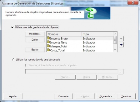 En primer lugar, realizaremos la definición de las selecciones dinámicas. Definiremos esta como del tipo “Selección Dinámica de Objeto“, y crearemos una para los atributos, y otra para los indicadores (tal y como vemos en la imagen).
