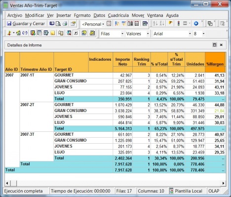 - Ranking Trim: el valor que aparece en esta columna nos indica el lugar que ocupa el importe de ventas de cada Target de Producto a nivel de cada Trimestre, con ordenación descendente.