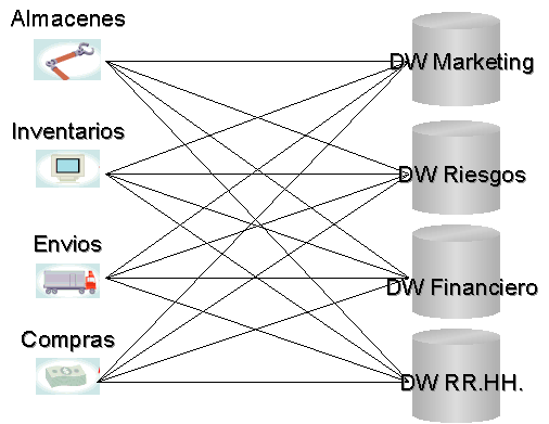 [[ad]]Visto el éxito del proyecto, otros departamentos, como el de Riesgos, o el Financiero se lanzan a crear sus Data Marts. Marketing, comienza a usar otros datos que también usan los Data Marts de Riesgos y Financiero, y estos hacen lo propio.