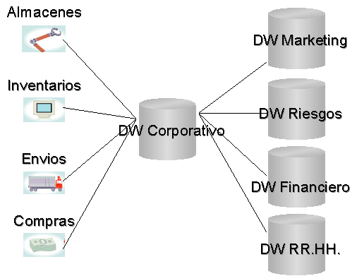 En esta situación los Data Marts obtendrían la información necesaria, ya previamente cargada y depurada en el Data Warehouse corporativo, simplificando el crecimiento de una base de conocimientos a nivel de toda la empresa.