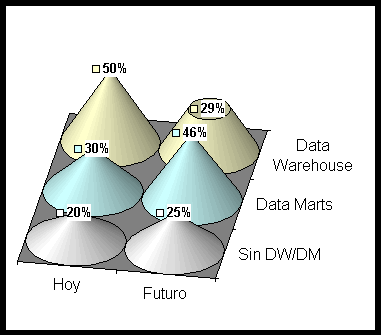 Según un estudio de IDC (International Data Corporation) tras analizar 541 empresas, la distribución de las implantaciones de Data Warehouse y Data Marts en la actualidad, y sus opiniones respecto a esta distribución en el futuro, nos muestra los siguientes datos: