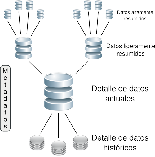 - Detalle de datos históricos: representan aquellos datos antiguos, que no son frecuentemente consultados. También se almacenan a nivel de detalle, normalmente sobre alguna forma de almacenamiento externa, ya que son muy pesados y en adición a esto, no son requeridos con mucha periodicidad. Este tipo de datos son consistentes con los de Detalle de datos actuales. Por ejemplo, en este nivel, al igual que en el anterior, se encontraría el detalle de una venta realizada en tal fecha, pero con la particularidad de que el día en que se registró la venta debe ser lo suficientemente antigua, para que se considere como histórica.