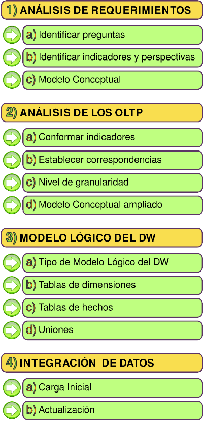 Como se puede apreciar, se comienza recolectando las necesidades de información de l@s usuari@s y se obtienen las preguntas claves del negocio. Luego, se deben identificar los indicadores resultantes de los interrogativos y sus respectivas perspectivas de análisis, mediante las cuales se construirá el modelo conceptual de datos del DW.