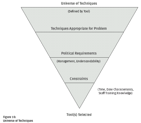 Recuerde que no todos los instrumentos y técnicas son aplicables a toda y cada tarea. Para ciertos problemas, sólo algunas técnicas son apropiadas (Vea el Apéndice 2, donde las técnicas asignan para ciertos tipos de problemas de minería de datos es hablada más detalladamente). “Requerimientos políticos” y otras restricciones adicionales limitan las opciones disponibles para el ingeniero de minería de datos. Puede ser solo una herramienta o técnica están disponibles para solucionar el problema a mano - y que el instrumento no pueda ser absolutamente lo mejor, de un punto de vista técnico.