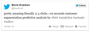 “Con el software empresarial, es raro ver el tipo de respuesta emocional que hemos observado en los usuarios de negocio cuando empiezan a utilizar BIRT Analytics", dice Pete Cittadini, CEO y Presidente de Actuate Corporation. “Los análisis son tan valiosos como el problema que resuelven. Estamos verdaderamente convencidos de que poniendo los análisis en manos de los usuarios de negocios, estos sienten el poder de obtener respuestas por sí mismos. Estos insights tienen profundo impacto en la organización, reduciendo drásticamente la latencia de negocio típicamente asociada con la minería de datos”.