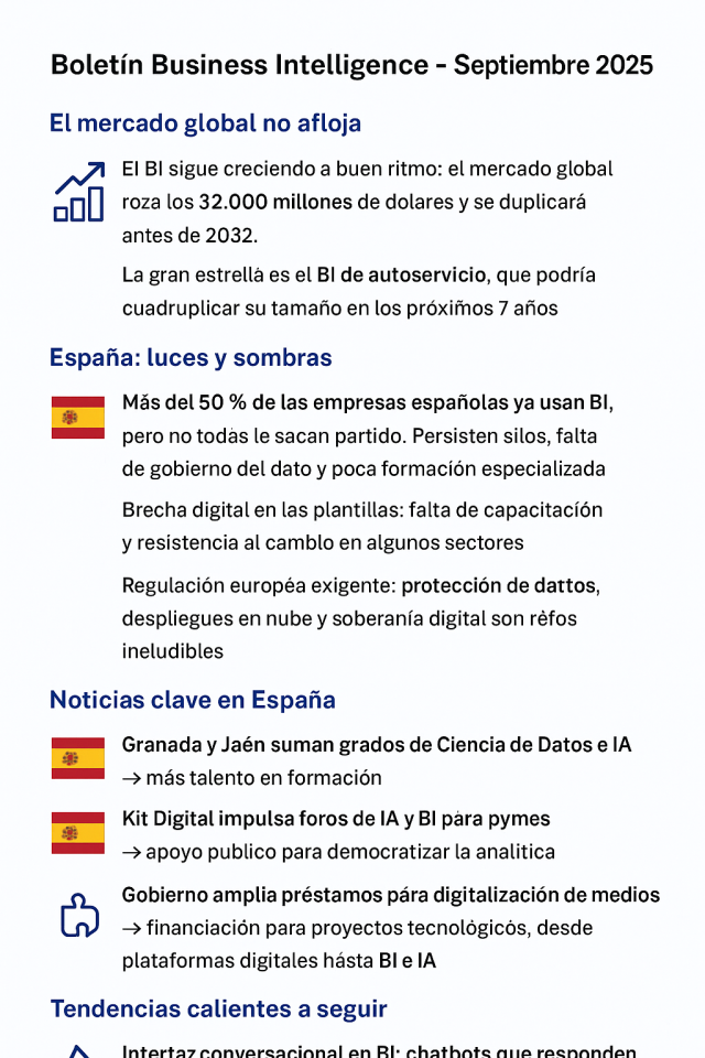 El BI entra en una nueva etapa: más accesible, más potenciado por IA, pero también más exigente en cultura de datos, regulación y formación. España ha avanzado bastante, pero los últimos informes muestran que aún hay trabajo por hacer para que la adopción sea estratégica, no solo técnica.
