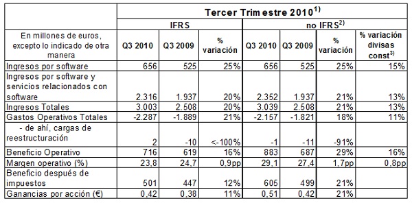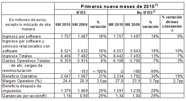 - Los ingresos IFRS por software y servicios relacionados con software en los nueve primeros meses de 2010 ascendieron a 6.520 millones de euros (2009: 5.630 millones de euros), un 16% más que en el mismo período del año pasado. Los ingresos no IFRS por software y servicios relacionados con software fueron de 6.560 millones de euros (2009: 5.640 millones de euros), lo que representa un incremento del 16% (10% en divisas constantes).