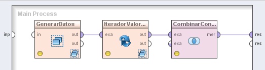 2. Agregar el operador Process Control → Loop → Loop Values. Cambiar el nombre del mismo a “IteradorValores”. Conectar la salida out del operador GeneradorDatos (Subprocess) a la entrada exa de este operador.