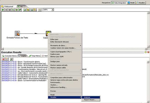 Pero lo realmente nuevo viene ahora. Si nos ponemos sobre la salida a tabla y sacamos el menú contextual (click con el botón derecho del ratón) nos aparecen, entre otros, la posibilidad de crear un modelo de metadatos o, directamente visualizar el resultado en una vista de Pentaho Analyzer o un informe. ¡El sólo crea el modelo de metadatos y el cubo OLAP!