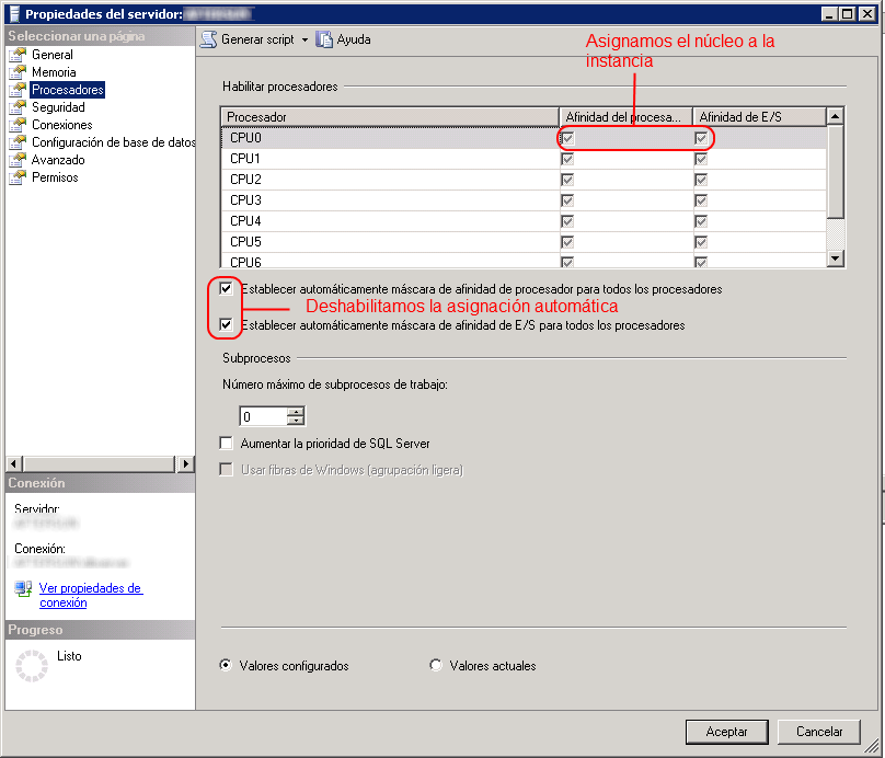 In un-core server dedicato 6 2 dei quattro processori in servizio l'ambiente di test, mentre i restanti 6 sono stati premiati l'ambiente di produzione. Per farlo dobbiamo solo aprire il SSMS e le proprietà del server: XXXX, nella parte di processori ogni processore attivare manualmente (deselezionando l'assegnazione automatica). Visualizza immagine.