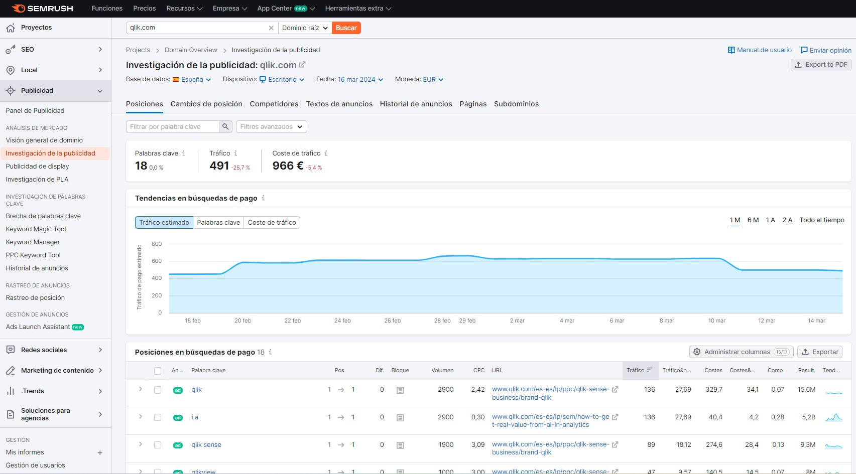 Con respecto a las palabras de pago, Google Ads, tan sólo hay que ir a la parte de Investigación de la publicidad y, también en la parte de Mejores palabras clave de pago, que nos muestra las Top Keywords de pago de Qlik, hacer click en 'Ver detalles' para acceder al listado de palabras clave que nuestra competencia tiene posicionadas en la parte de búsquedas patrocinadas del buscador, con lo que estaremos accediendo a un listado de palabras seguramente muy bien elegidas, con valoración de CPC incluída, y que están llevando posibles clientes a nuestros competidores desde los resultados de búsqueda patrocinados.