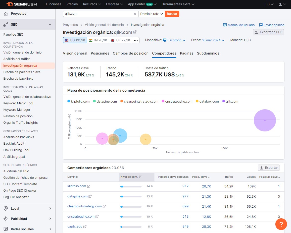 Para el ejemplo de este videotutorial nos ponemos en la piel de Qlik, el fabricante del Software de BI QlikView, para averiguar qué nos dice SEMrush acerca de sus competidores en posicionamiento orgánico y de sus competidores en posicionamiento de pago, o búsquedas patrocinadas, y con qué palabras clave están compitiendo en ambos entornos.