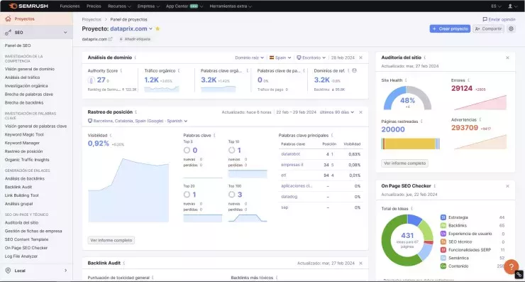 Site Audit es uno de los rastreadores más rápidos y completos del mercado. Detecta más de 140 problemas técnicos (velocidad, Core Web Vitals, errores de crawl, problemas de indexación, hreflang en sitios multilingües) y genera informes priorizados por impacto SEO. Especialmente relevante para portales como Dataprix donde la arquitectura de información y el crawl budget son críticos.