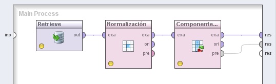 3. Agregar el operador Data Transformation → Attribute Set Reduction and Transformation → Principal Component Analysis. Cambiar el nombre del mismo a “Componentes Principales” y conectar la salida exa del operador Normalización (Normalize) a la entrada exa de este operador, y las salidas exa y pre a sendos conectores res del panel.