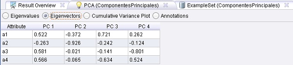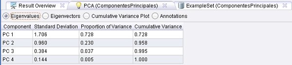 El cálculo de componentes principales se usa con frecuencia como un paso de procesamiento de la transformación de características. Puede reducir la dimensionalidad del conjunto de datos en cuestión, mientras se preservan las varianzas más importantes de los datos. Ejecutar el proceso y comprobar la salida en la vista gráfica del conjunto de datos Iris cargado y transformado por este proceso.