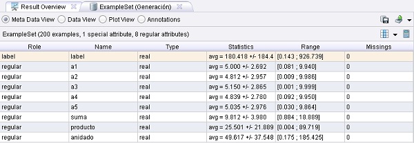 Este proceso carga datos numéricos desde el archivo y genera algunos atributos con el operador de generación de características. La lista de parámetros functions del operador de generación debe ser editada