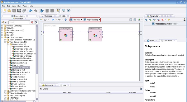 3. Conectar la salida del operador Retrieve a la entrada del operador Preprocesamiento (Subprocess) y luego doble clic sobre este último (observar que aparece un botón en la parte superior de este marco, al lado de “Process”, y que permite alternar entre el proceso y los subprocesos). En el panel Nested Chain del subnivel, agregar los siguientes operadores: