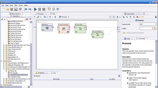 El siguiente operador es el operador de minería de conjuntos de ítems frecuentes FPGrowth. Este operador calcula eficientemente conjuntos de valores de atributos que ocurren juntos con frecuencia. A partir de estos así llamados conjuntos de ítems frecuentes se calculan la mayoría de las reglas de confianza con el generador de reglas de asociación.