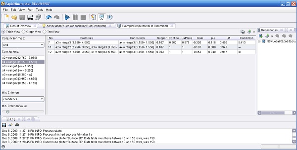 5. Ejecutar el proceso. El resultado se mostrará en un visor de reglas donde se puede seleccionar la conclusión deseada en una lista de selección en el lado izquierdo. Como para todas las otras tablas disponibles en RapidMiner, se pueden ordenar las columnas haciendo clic en la cabecera de la columna. Presionando CTRL durante estos clics permite la selección de hasta 3 columnas para ordenar.