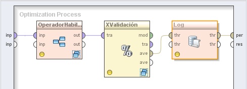 Este meta-proceso muestra otra posibilidad de optimizar automáticamente el diseño del proceso. El operador "OperatorEnabler" se puede utilizar para habilitar o deshabilitar uno de sus hijos. Este se puede utilizar junto con uno de los operadores de optimización de parámetros para comprobar qué operadores se deben emplear para obtener resultados óptimos. Esto es especialmente útil para determinar qué operadores de preprocesamiento se deben usar para una combinación particular de conjunto de datos-aprendiz.