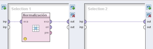 4.1 Data Transformation → Value Modification → Numerical Value Modification → Normalize. Cambiar el nombre del mismo a “Normalización”. Conectar la entrada inp del panel a la entrada exa de este operador y la salida exa de este último al conector out del panel.