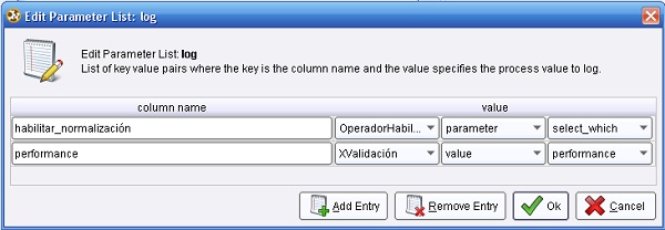 3.3 Utility → Logging → Log. Conectar la salida ave (averagable 1) del operador XValidación (XValidation) a la entrada thr (through 1) de este operador y la salida (through 1) del mismo, al conector per (performance) del panel. En el parámetro log de este operador editar la lista de parámetros para incluir los campos “habilitar_normalización” y “performance”: