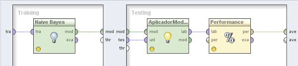5.1 Modeling → Classification and Regression → Bayesian Modeling → Naive Bayes. Conectar la entrada tra y salida mod del mismo a los puertos tra y mod del panel, respectivamente.