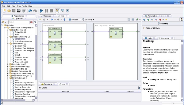 RapidMiner soporta Meta Aprendizaje incorporando uno o varios aprendices básicos como hijos en un operador de meta aprendizaje padre. En este ejemplo se genera un conjunto de datos con el operador ExampleSetGenerator y se aplica una versión mejorada de Stacking sobre este conjunto de datos. El operador Stacking contiene 4 operadores internos, el primero es un aprendiz que debe aprender el modelo stacked de las predicciones de los otros 4 operadores hijos (aprendices básicos). Otros esquemas de meta aprendizaje como Boosting o Bagging solo contienen un operador de apredizaje interno. En ambos casos los parámetros de los esquemas de aprendizaje internos son establecidos directamente por los operadores de aprendizaje básicos. No es necesario tratar con los diferentes estilos de parámetros para los operadores internos y los de meta aprendizaje.
