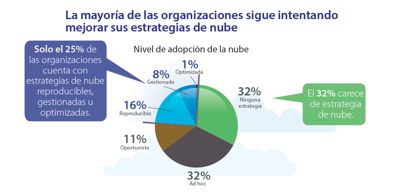 Sólo el 25 por ciento de las organizaciones ha alcanzado un cierto nivel de madurez en la utilización de la nube, aunque más del cincuenta por ciento ya la están usando. Y aunque únicamente una de cada cien compañías tiene una estrategia cloud optimizada, la mitad de las ellas esperan que el Cloud les ayude a incrementar sus ingresos durante los próximos dos años.