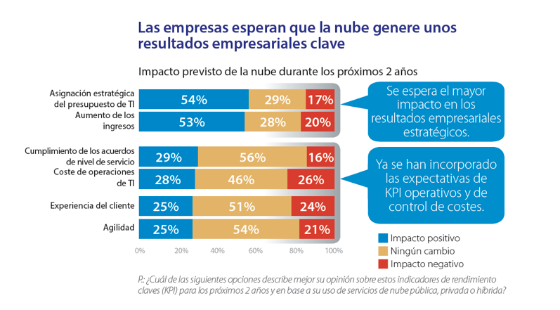 - Plataforma para el crecimiento y la innovación. El Cloud está entrando en una segunda oleada de adopción donde las compañías no se centran únicamente en la reducción de costes y el cumplimiento de los Acuerdos de Nivel de Servicio (SLAs), sino que se apoyan en la nube como plataforma clave de crecimiento e innovación. Así, el 54% de los encuestados esperan que el Cloud les ayude a asignar el presupuesto de TI de una manera más estratégica en los próximos dos años, y el 53% creen que gracias a la nube aumentarán sus ingresos (Figura 2).